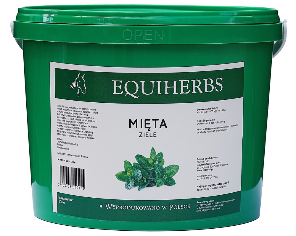 Mięta dla koni jest ziołem wszechstronnym: pobudza czynność trawienną żołądka, działa rozkurczająco. Korzystna dla koni z delikatnym przewodem pokarmowym, ze skłonnością do kolek, działa uspokajająco i łagodząco na przewód pokarmowy, stosowana w zaburzeniach trawienia, braku apetytu, skurczach żołądka i jelit.